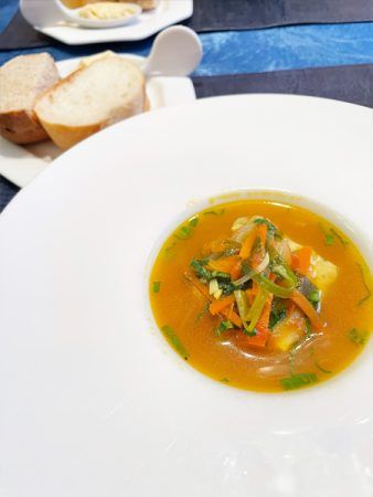 スープは魚のスープ。ブロッコリーとハモをムースに仕立てたもの。優しい味が体に染み渡ります。