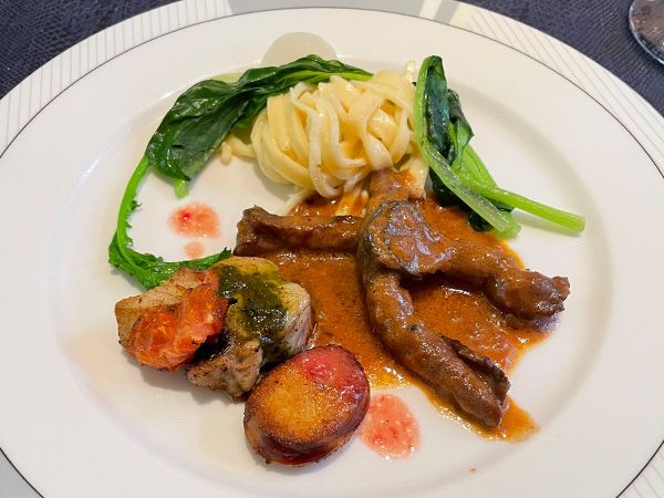 そしてメインディッシュです。メインディッシュは3種類(サワラのロースト・ポトフ・本日のおすすめ)の中から選べ、私が選んだのは「本日のおすすめ」。シェフの友人が釣ったスズキ・ビーフストロガノフ・パスタの3品です。お肉も魚もパスタも1度に味わえてとてもお得感があります。