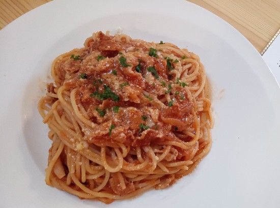 ひとくちもらって食べたのですが、もちもちのパスタに肉と玉ねぎの旨味を感じる美味しいトマトソースパスタでした。酸味がまろやかで食べやすいと思いました。