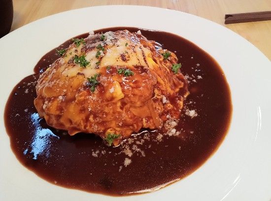 焼きチーズの自家製ハヤシソースのオープンオムライスです。