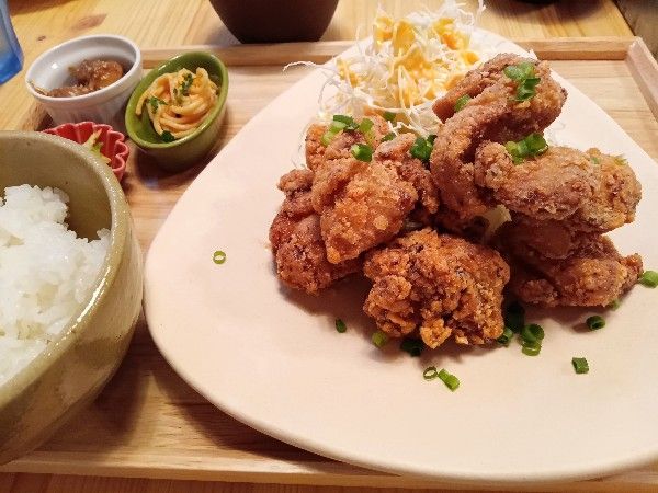 唐揚げ定食です。ここでメニュー表をもう一度見てください‼唐揚げの定食だけで何と4種類もあるんです。これかなり悩みました…初回なのでシンプルに醤油味と思い、会津醬油仕込みの鶏もも唐揚げ定食にしました。