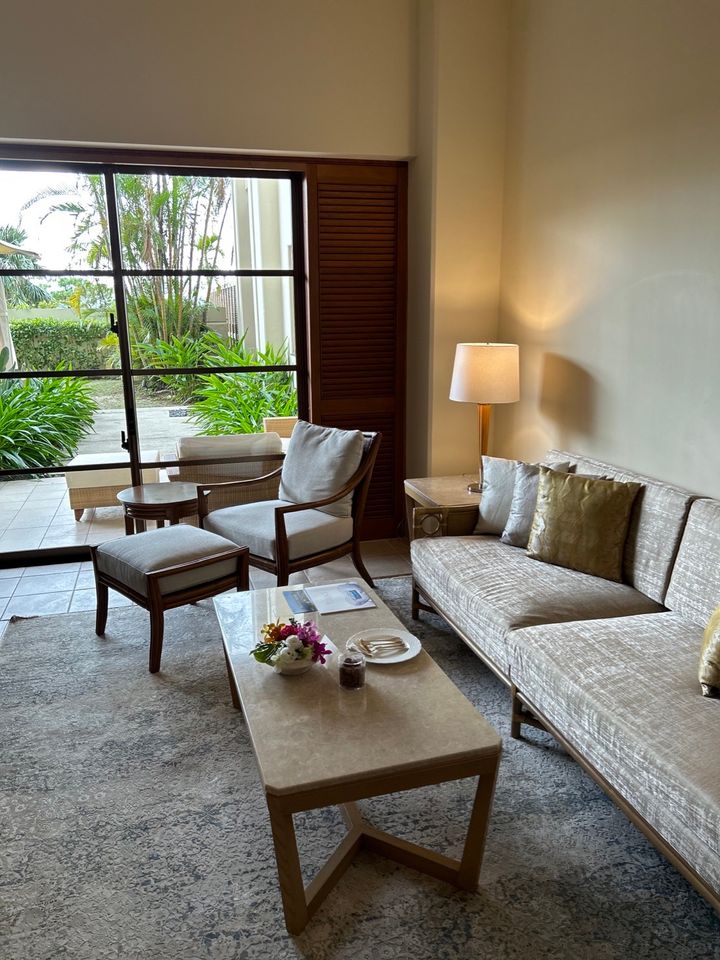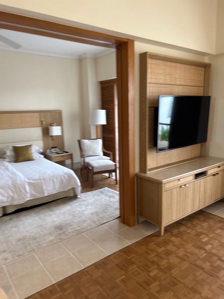 私たち家族が宿泊したクラブフロアのお部屋「ガゼボスイート」の紹介をしていきます。スイートルームがある専用の扉をくぐり進んで行きます。ビーチへ続く芝生の庭、ジェットバス、ミニキッチン、室内外にリビングセットがあります。70平方メートル以上の広いお部屋にベッドは4台設置も可能です。