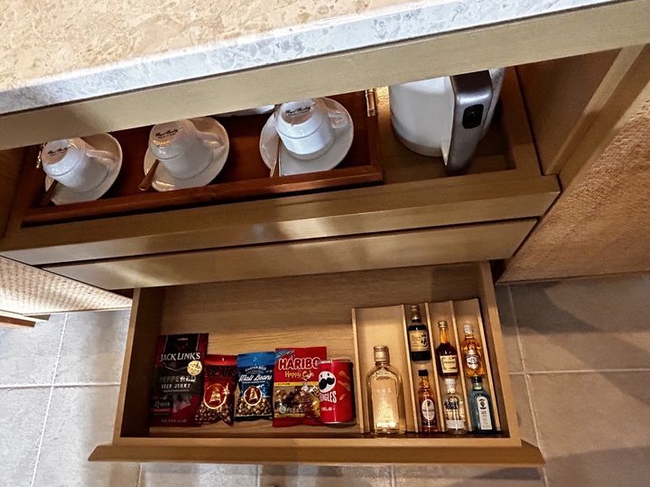 冷蔵庫内のドリンクやお部屋内のミニボトルのアルコール、お菓子、スナック菓子全てフリーです。