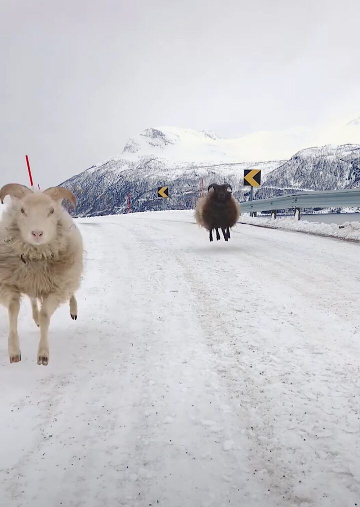 3. 山道を散歩するヒツジたち。雪も降ってテンションが上がっているのか、ぴょんぴょん跳ねているのがかわいい!!【海外・動画】