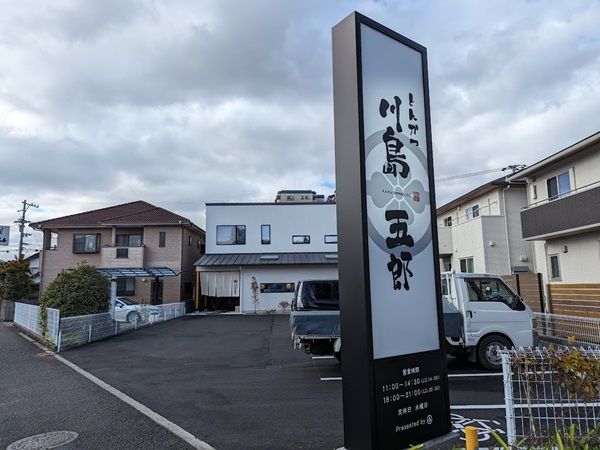 川島五郎! まるで人の名前のような店名と思っていたらまさかのその通りでした!! 敷地内には駐車場もあるので車での来店も安心。 店内はお客様でいっぱいだったので写真は撮れませんでしたがテーブル席とオープンキッチンのカウンターがありましたよ。