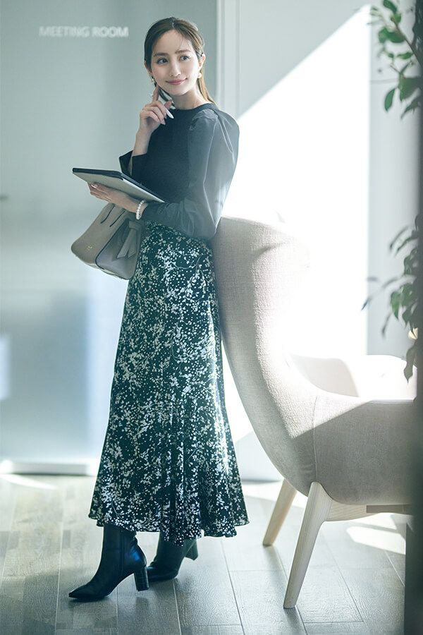 華やか見えしそうなパワショルトップスや花柄スカートも、黒で甘さを引き算すれば大人な印象に。足元も黒でシックにまとめつつ、ヒールで女っぽさも。