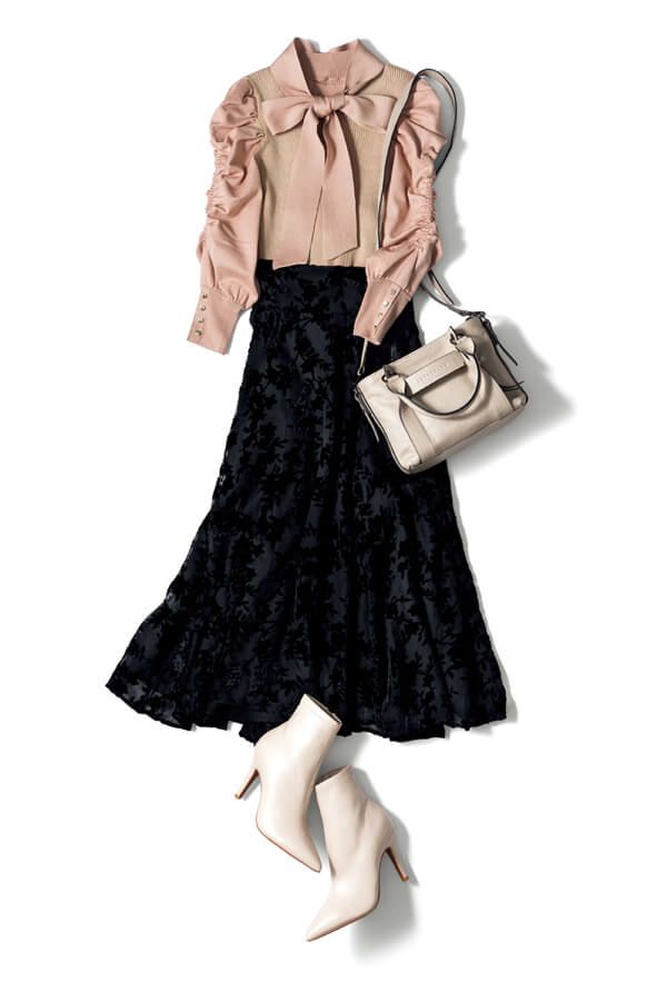 甘口なボウタイニットも黒スカートの効果でシックな華やぎ