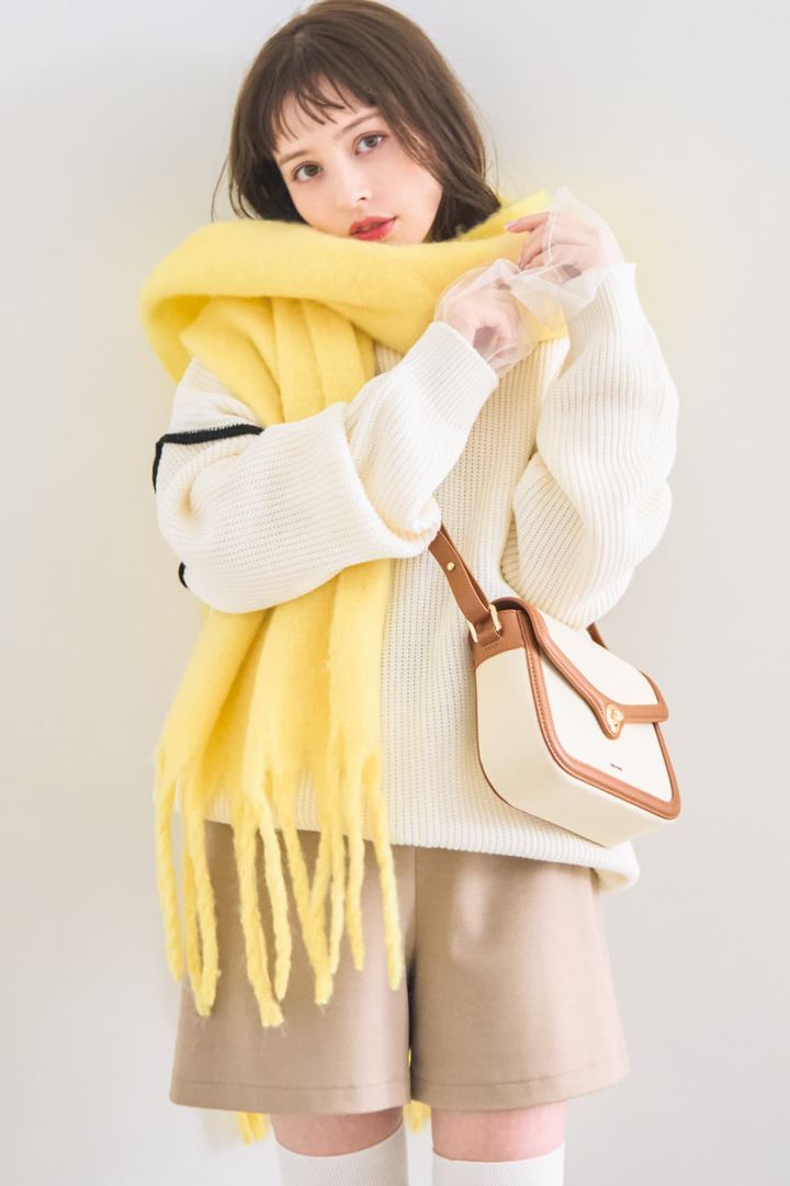 2WAYシアーえりつきブラウス 4,950円/w closet(WEARS INC.) 白ニット 12,870円/ACYM ベージュショートパンツ 7,590円/LILLIAN CARAT(リリアン カラット) イエローマフラー 6,050円/ROSE BUD(ROSE BUD ルミネエスト新宿店) バッグ 12,963円/スクエアライン(HANA) ニーハイソックス 1,540円/靴下屋(Tabio)