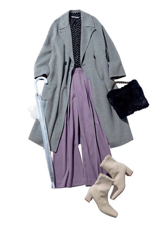 ウールコート¥29,000/PLST、カラーワイドパンツ¥10,900/イェッカ ヴェッカ 吉祥寺、水玉ブラウス¥6,590/ZARA(ザラ)、エコファーバッグ¥13,750/ダイアナ(ダイアナ 銀座本店)、ショートブーツ¥3,990/GU、傘/スタイリスト私物