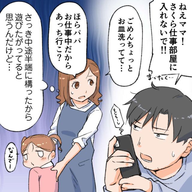 「ごめん、ちょっとお皿洗ってて・・ほらパパお仕事中だからあっち行こ?」