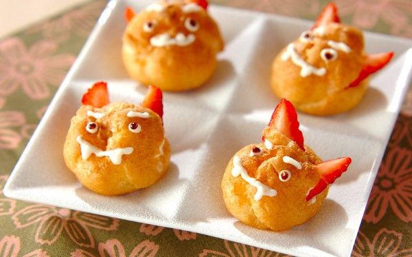 市販のシュークリームを使って、簡単にかわいくデコレーション。イチゴをツノに見立て、チョコペンで表情をつけるだけです。これなら子どもと一緒に楽しみながら作れそうですね。おやつや食後のデザートにぜひ。