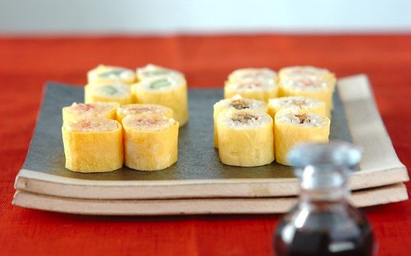 海苔の代わりに薄焼き卵で巻くアイデア寿司。細く巻いてひと口サイズにすれば、小さな子どもでも食べやすいですね。キュウリの漬物、カニカマ、マグロのたたき、ウナギの蒲焼きなど具材をいくつか用意すると、選ぶ楽しさが広がりますよ。