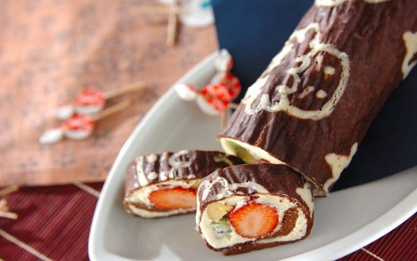 節分の日に、フルーツたっぷりなスイーツ恵方巻きはいかがですか? ココア生地で海苔らしく見立てます。断面がとってもキュートです。オニ模様などデコレーションすると、子どもも喜んでくれそうですね。