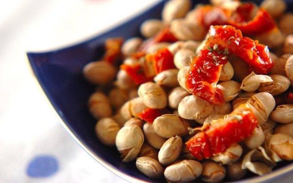 大豆がお酒に合うおつまみに変身! ドライトマトの戻し汁で炒め、仕上げにバジルを混ぜ合わせてイタリアン風に仕上げます。ポリポリと食べられて、ビールやワインと相性抜群です。