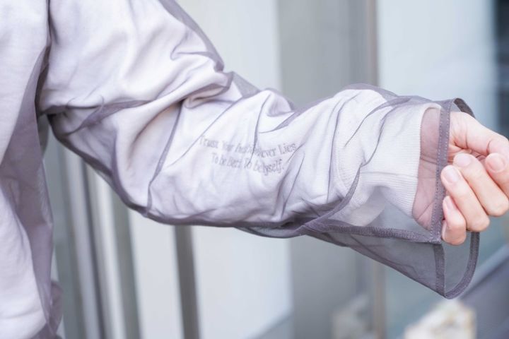 「スエットの刺繍が透けて見える組み合わせがお気に入り。今日のようにスエットの上から重ねたり、ブラトップと合わせて肌見せを楽しんだり、さまざまなレイヤードを楽しめます」intuitionのシアートップスは本人私物