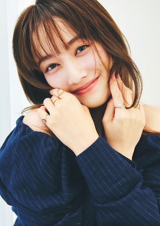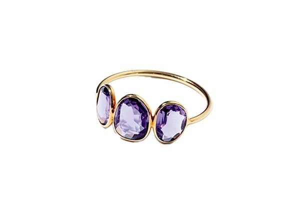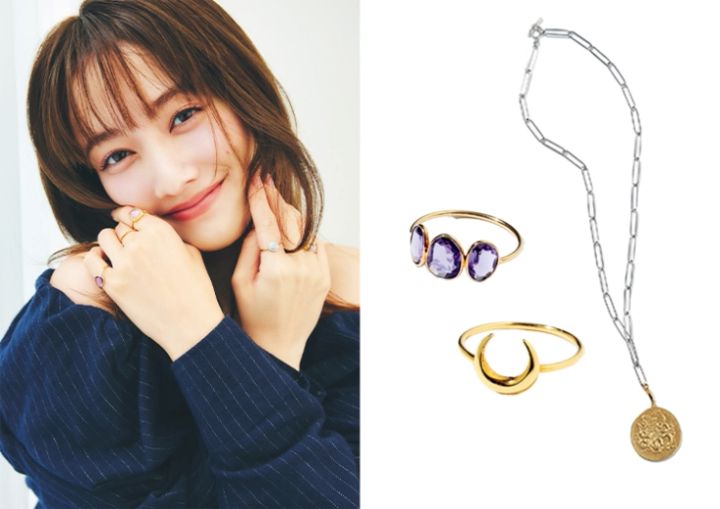 左手小指から右へ・リング(K18YG×アメジスト)¥110,000、(K18YG×ダイヤモンド)¥93,500、(K18YG×ローズクォーツ)¥167,200、右手人さし指から右へ・リング(K18YG×K18WG×ダイヤモンド)¥205,700、(K18YG×サファイア)¥152,900/以上マリハ ブラウス¥31,900/styling/(styling/ルミネ新宿1店)