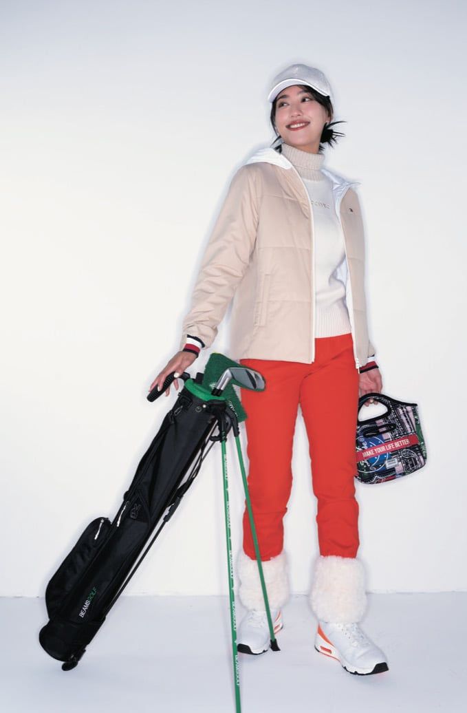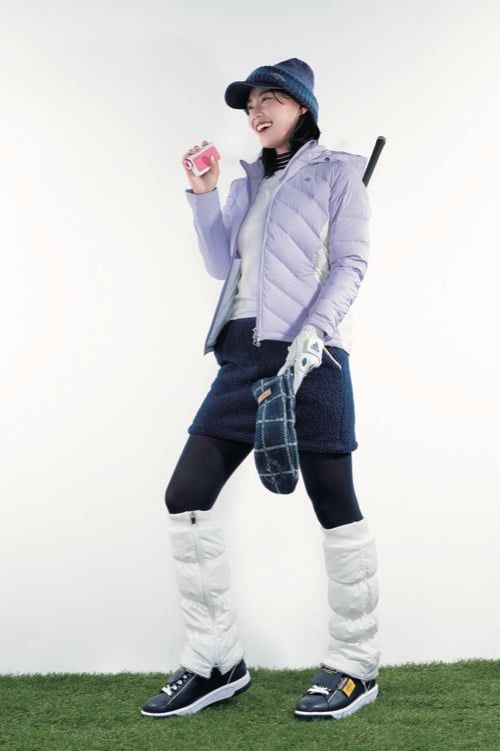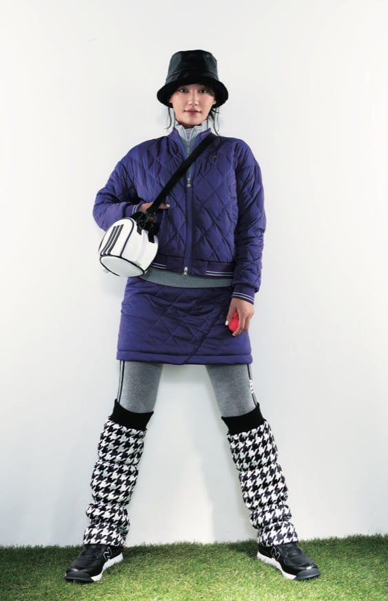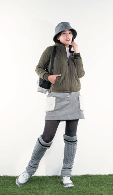 ブルゾン¥38,500(テーラーメイドアパレル/テーラーメイド ゴルフ) ニット¥14,300(ルコックスポルティフ/デサントジャパン) スカート¥17,600(ロサーセン/グリップインターナショナル) サンバイザー¥4,730(マンシングウェア/デサントジャパン) ニットキャップ¥5,280(キャロウェイアパレル/キャロウェイゴルフ) グローブ〈片手〉¥2,200(アディダスゴルフ/アディダスジャパン) レッグウォーマー¥10,450(ジュン アンド ロペ) シューズ¥30,800(ホーンガーメント/キューブ) へッドカバー¥7,150(パーフェクトタン/澤田) タイツ/スタイリスト私物