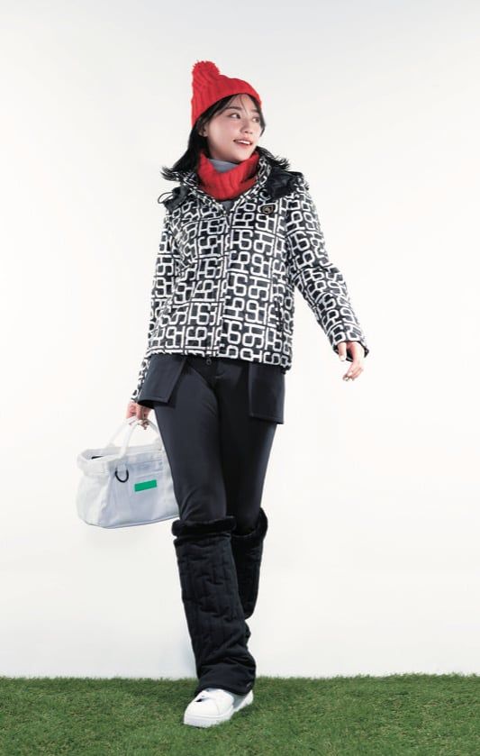 ジャケット¥19,635(サンディ) 中に着たニット¥37,400(ブラック&ホワイト/ブラックアンドホワイトスポーツウェア) パンツ¥47,300(マーク & ロナ/マーク & ロナ表参道ヒルズ店) ニット帽¥3,960、ネックウォーマー¥3,960、レッグウォーマー¥9,350(以上アディダスゴルフ/アディダス ジャパン) バッグ¥16,500(5525golf) シューズ¥17,