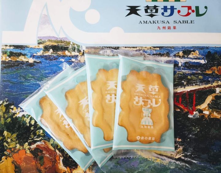代表菓子のひとつが天草五橋と藍の海を描いたパッケージのお菓子「天草サブレ」です。熊本出身の漫画家・尾田栄一郎先生の作品『ONE PIECE』の劇場版とコラボした特別デザインも販売されたりと、50年以上も愛され続けています。