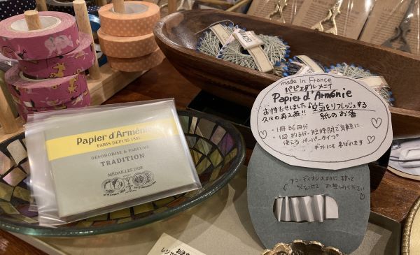 初めて訪れた際に、購入したものの一つ『紙のお香』(made in France)。ほのかに香るこちらは、衣類に忍ばせたり栞としての使い方もできるのだそう。香りがしっかりというよりは、「空気をリフレッシュする」という説明通りでした。ギフトにも♪