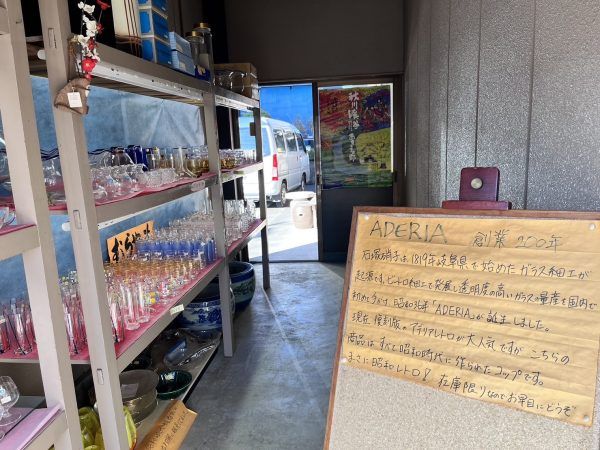 私はアデリアが好きで、復刻版の耐熱容器なども使っているのですが、看板横の棚を見てみると、確かにアデリアが並んでいます!