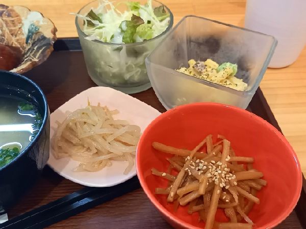 この日の小鉢はサラダ・マカロニサラダ・もやしナムル・きんぴらごぼうの4品。