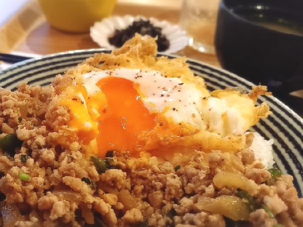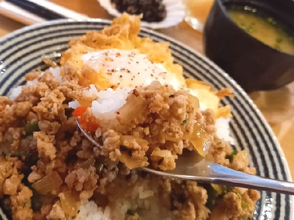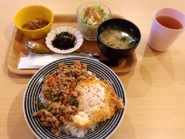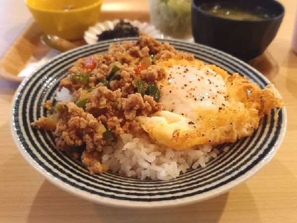 ガパオライスなのに、和食らしい小鉢や味噌汁が付いてくるのが、ホッとするポイント♪