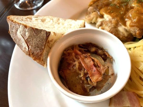 パンか雑穀米を選べたので、パンをチョイス。付け合わせはジャガイモやベーコン、玉ねぎ、牛肉などの煮込み(?)でスパークリングワインに合う~。