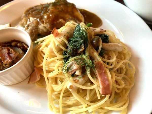 パスタは本日のパスタ(ベーコンときのことほうれん草のペペロンチーノ)をチョイス。ニンニクが程よくきいていて美味しい♪