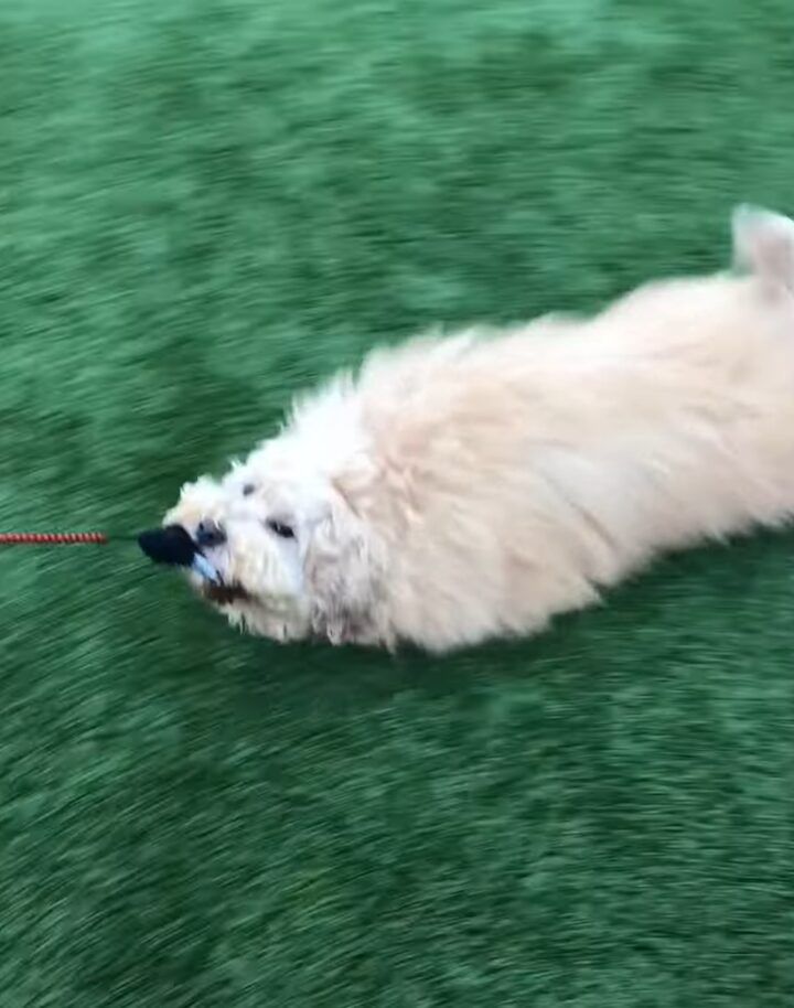 芝生で飼い主さんに引っ張ってもらっている愛犬。 その様子は、こちらの動画からご覧いただけます。
