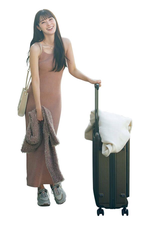 コート¥13,970/VIS カーディガン×ワンピースセット¥16,500/リリアン カラット イヤリング¥3,080、ネックレス¥4,290/ともにアネモネ(サンポークリエイト) バッグ¥2,790/Isn’t She? キャリーケース¥22,000/& シュエット(& シュエットギャラリー 池袋サンシャインシティアルパ店) スニーカー¥2,970/神戸レタス