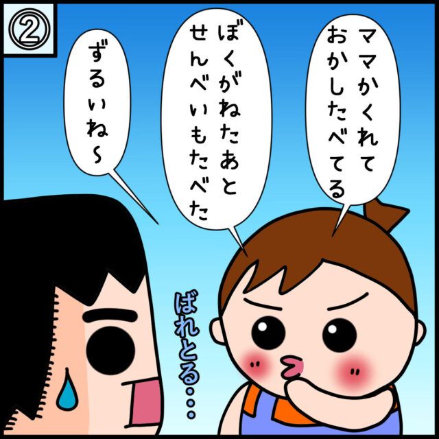 2. しーっ!!「かくれてお菓子食べてた」抜け目なくママを観察する5歳長男、オカンになる。|みーぱぱ子育て漫画