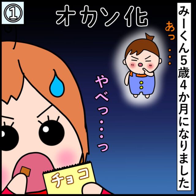しーっ!!「かくれてお菓子食べてた」抜け目なくママを観察する5歳長男、オカンになる。|みーぱぱ子育て漫画
