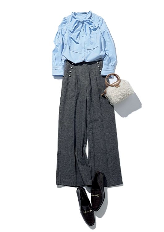 パールつきパンツ¥14,300/JILL by JILLSTUART ボウタイブラウス¥16,500/リランドチュール バッグ¥13,750/ダイアナ(ダイアナ 銀座本店) ローファー¥2,640/神戸レタス