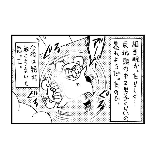 ひぇぇ!凄まじい暴れよう・・・相当眠かったのですね(汗)こんな大変なことになるのなら寝かせておこうとなりますね・・・。