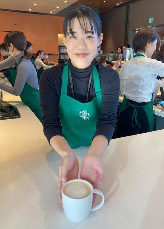 店長の長岡芽唯さん。同店おすすめのドリンク「スターバックス ブロンド ラテ with オーツミルク」(Tall490円)。