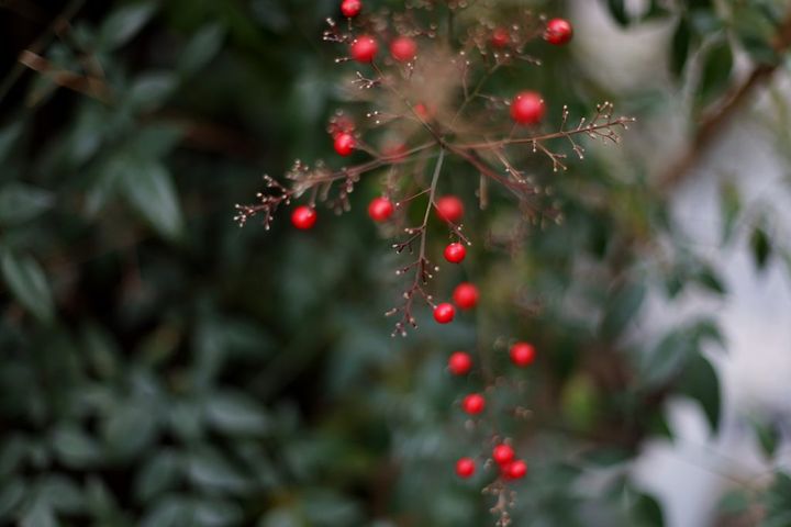 わが家の玄関先にある南天の木。お正月の食卓のしつらえに葉をとってよく飾りました。ティーライトキャンドルの下に敷いても趣よく、見慣れた和菓子に添えても特別な雰囲気に。いろいろなシーンで活躍してくれます。