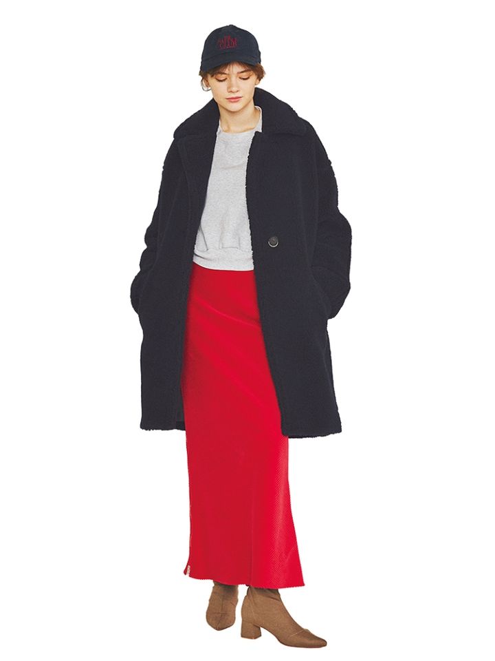 ラフなキャップやスエットもだらけないのは、まっすぐ下に伸びる赤スカートのおかげ。防寒性の高い肉厚なコートでも中のスマートなシルエットによって、「きゃしゃな体を包み込む」イメージを演出。