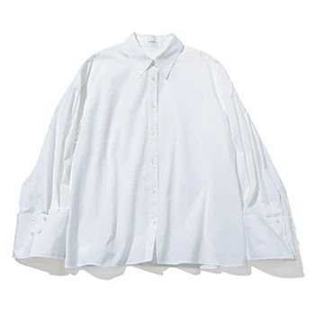 シャツ本来のきちんと感やベーシックさはそのままに、気負わずに着られるワイドなボックスシルエット。そでにはタックをほどこしさらにリラックス。コシのあるTCタイプライター素材。