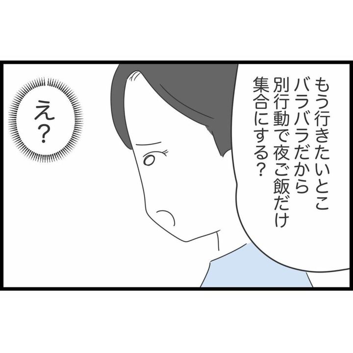 結局この日は、それぞれの行きたい場所が違うため別行動をすることに…。友人の自分勝手な言動に、すみれさんはモヤモヤしています。せっかくのプランをどれも採用してもらえないなんて、イラっとしますよね…。