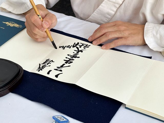 2024年度は1月1日〜3日の御朱印対応はしておらず、1月4日から受け付けていました。持参した御朱印帳なら2ドル、半紙の御朱印なら3ドルを納めて、番号札をいただき順番を待ちます。このときは早朝という時間帯も相まって、境内は落ち着いていたので、目の前で書いている様子を見ることができました。