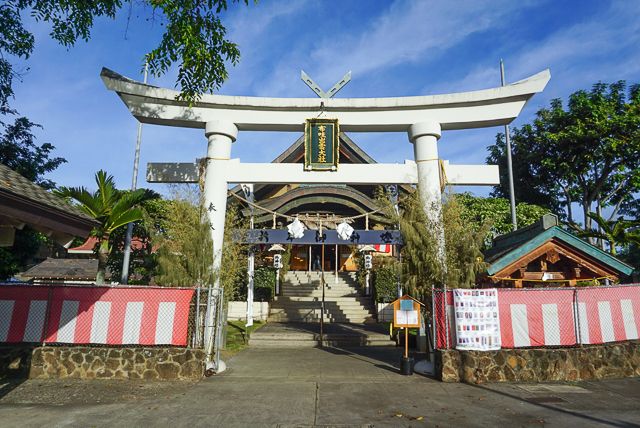 入り口の大きな鳥居に掲げられている「布哇出雲大社」の文字。「布哇」は当時の移民が考えた当て字で「ハワイ」と読みます。
