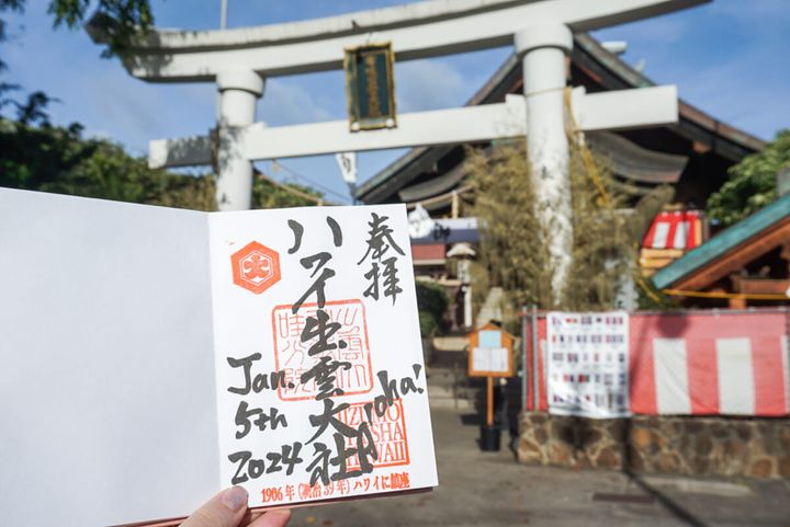 「奉拝ハワイ出雲大社」の横に添えられたのは、英語の日付と「Aloha!」の文字。特別感のある御朱印がうれしくて、しばらくじっと眺めてしまいました。