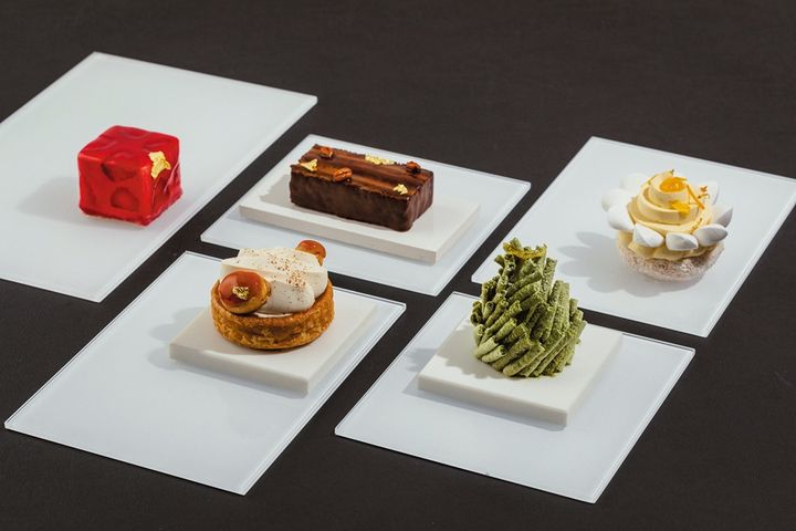 例えばパリの「オペラ座」がルーツのお菓子「オペラ」なら、あえて倒して。層を五線譜に見立て、キャラメリゼした麦のポン菓子を音符のように踊らせる。周りを極薄チョコで囲むことでコーヒーシロップをこれまで以上にひたひたに染み込ませた。パイやシュー、クリームなど、パティシエの技が詰まった伝統菓子「サントノーレ」も見違えている。焦がし発酵バターを加えたパイは、ぐるりとリングにして深めに焼き込み、ザックザクに。クリームの決め手はバニラをローストすること。いつもと違う少しモルティなバニラ香にそそられる。「フォレヴェール」はアルザスの名店で学んだお菓子を、和の食材でアップデート。メレンゲとムースがふわりとほどけて、抹茶の滋味にみずみずしい柚子の香りが重なる。ニュークラシックなフランス菓子が、いまの私たちを最高に幸せにしてくれる!