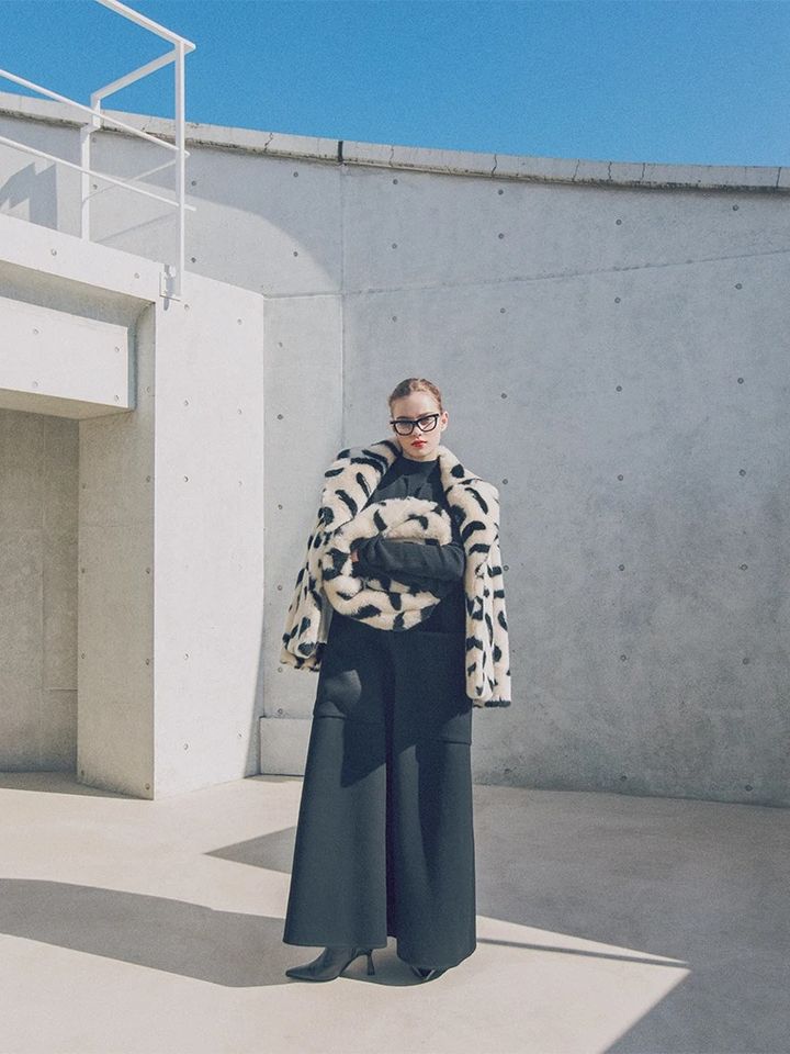 白×黒ファージャケット 51,700円、ファーバッグ 29,700円/ともにJakke(ジャック・オブ・オール・トレーズ プレスルーム) 黒ノースリーブワンピース 145,200円/ポステレガント 中に着たリブニット 42,900円/THE NEWHOUSE(アーク インク) 眼鏡 57,200円/ボッテガ・ヴェネタ(ケリング アイウエア ジャパン カスタマーサービス) ロングブーツ 22,000円/ステュディオス(ステュディオス カスタマーサポート) 同じ柄のバッグをそえれば、さらにキャッチー。