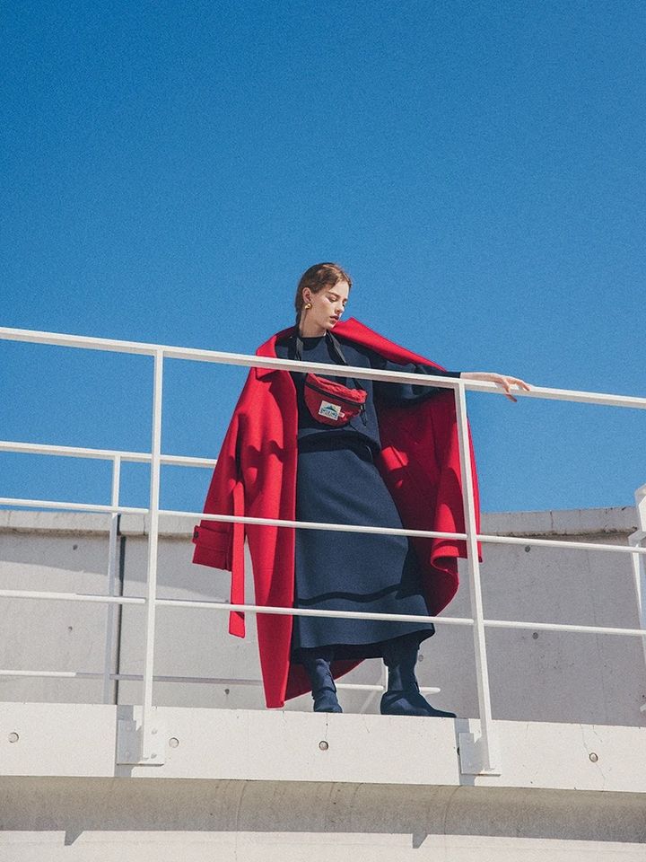 実は同色で重ね着したインを整えるように、鮮烈な赤いコートを選択。さっと肩がけし、着流す程度でサマになる。赤でリンクさせたバッグを首からさげて、気負いのない着こなしを意識して。ニットスカートとタイツ感覚で使えるニットジョガーパンツをレイヤードして冷気をとことんシャットアウト。