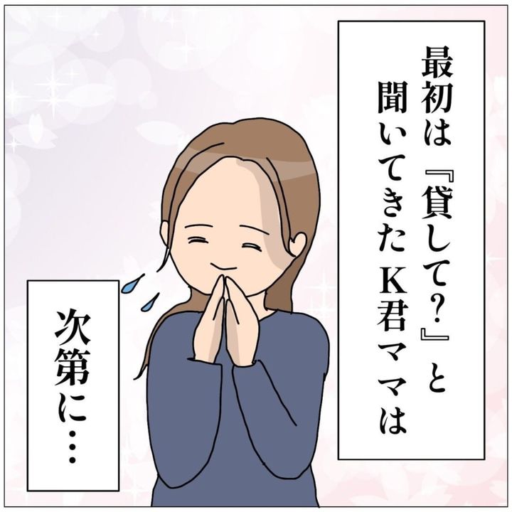 最初は気さくで好印象だったKくんママは、次第に上から目線で乱暴に思える態度をとるようになっていきました。あまりにも当たり前に物を借りようとするKくんママを、他のママたちは警戒するようになりました。