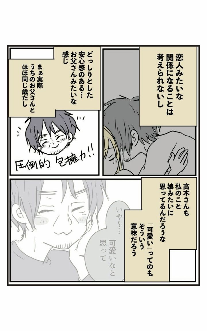 親子に近いほど年が離れている、歳の差カップル。世の中によくいる夫婦と少し違っていることで、家族から結婚を反対されたり、周囲から変に注目されたりすることがあるようです。年の差のある恋愛中で幸せを感じている方の中でも、周りの反応が気になるという方はいるかもしれませんね。この漫画でも、主人公・美咲と、ひょんなきっかけで出会ったおじさん・高木が、お互いに惹かれることに戸惑うシーンが描かれます。