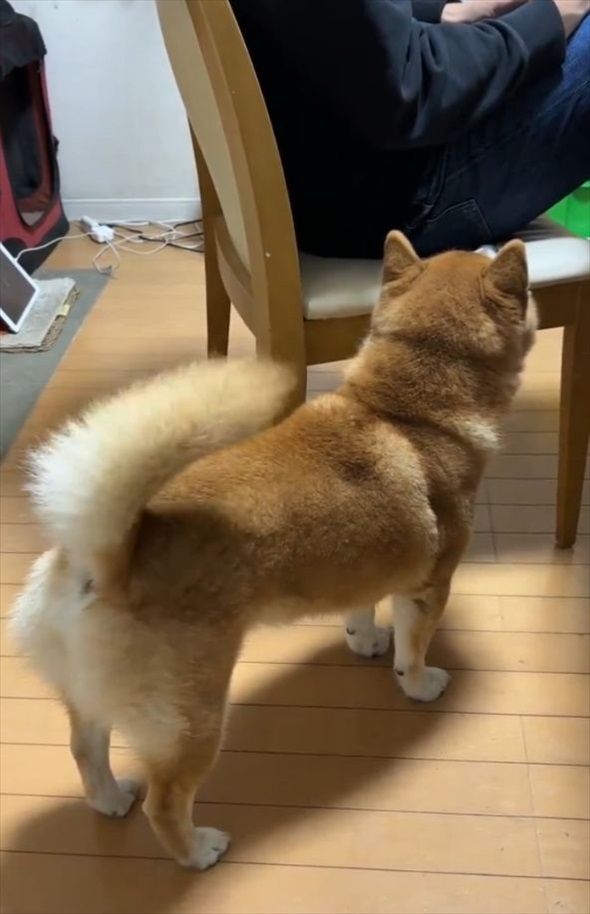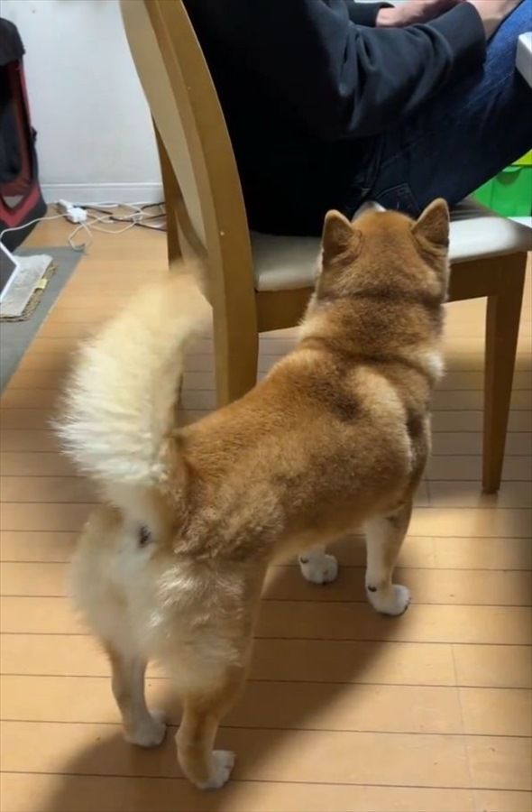 しかし、全身でアピールすることなく、斜め後ろからじっとしっぽを振っているだけだからか・・・、飼い主さんは小太郎くんのアピールに気が付きません。 ナデナデして!と考えている一方で、飼い主さんの邪魔をしないようにと気遣っているのかもしれませんね。