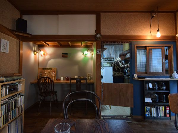 昭和レトロなアパートがおしゃれに変身! 正面左手に見えるのは、アパートの押し入れをカウンターにしたカウンター席、右手では店主さんがハンドドリップで珈琲をいれてくれています。